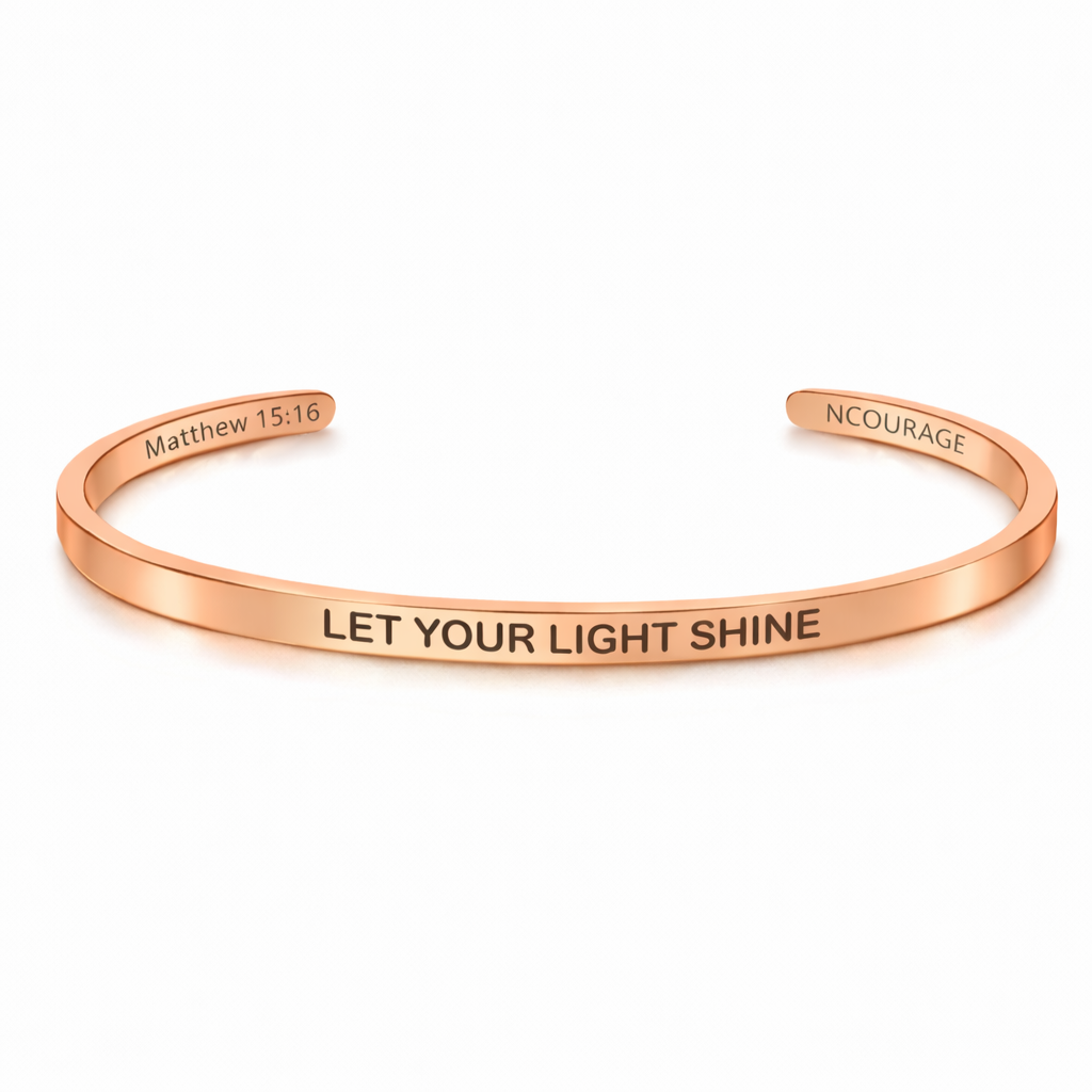 Elevate your style with our exquisite Christian bracelet, designed to inspire and uplift. With 'LET YOUR LIGHT SHINE' inscribed on the outside and Bible reference Matthew 15:16 on the inside.  This stunning piece of Christian jewellery is crafted from high-quality stainless steel, available in three beautiful finishes: Gold, Rose Gold, and Silver. Each bracelet is 18k gold plated for the gold and rose gold variants, ensuring a luxurious and durable finish that stands the test of time.